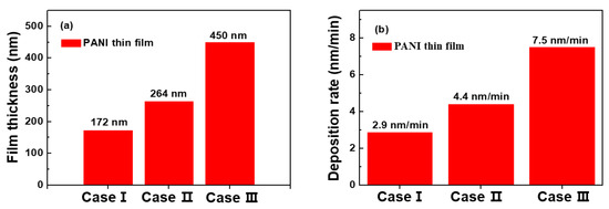 Figure 7a,b show the film thicknesses and deposition rate variations for PANI thin films deposited by the APPR with the pin electrode on glass substrates under optimal conditions for 1 h with respect to three electrode configurations. For case III, the film thickness and deposition rate of the PANI thin film were about 450 nm and 7.5 nm/min, respectively. For case III, the PANI thin film with the highest film thickness and deposition rate was obtained. This trend may be mainly due to the supply of excited species, such as RNS and argon radicals, formed within the gas-feeding tube into the nucleation or fragmentation region. The additional increase in RNS and argon radicals within the gas-feeding tube requires additional power consumption, which is confirmed by a higher dissipated power during AP polymerization for case III (Table 2).