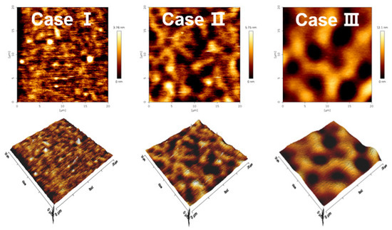 Two- and three-dimensional AFM images of PANI thin films prepared by APPR with pin electrode under optimal conditions with respect to three electrode configurations (cases I, II, and III).