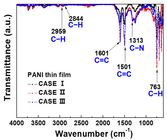 Figure 9 shows the FTIR absorption spectrum of the PANI thin films deposited on silicon wafer substrates for 1 h by APPR under optimal conditions with respect to three electrode configurations (cases I, II, and III). Herein, all spectra show the characteristic peaks of the PANI polymer at 2959, 2844, 1601, 1501, 1313, 1250, and 763 cm−1. The peaks at 1501 and 1601 cm−1 are attributed to benzenoid and quinoid ring stretching vibrations, respectively. The band at 763 cm−1 is ascribed to the C–H out-of-plane deformation from the aromatic ring, and the peak at 1313 cm−1 is attributed to the C–N stretching vibration [17,27]. In addition, the assigned peaks at 2844 and 2959 cm−1 are attributed to the stretching within the polymer chains [17,27]. From the FTIR spectra, the peak assignments of the PANI thin films deposited by APPR are represented in Table 4. In particular, the FTIR peak intensities of the π-conjugated bonds (1501 and 1601 cm−1) and the C–N bond (1313 cm−1) increased for cases (cases II) when compared to case I. The enhancement of the C–N peak is related to the electrical conductivity due to the nitrogen atom of the quinone ring [28,29]. Moreover, the increase in π-conjugated bonds is expected to enhance the π–π stacking of intermolecular polymer chains, thereby resulting in good carrier mobility and improved electrical conductivity [28,29]. Hence, the proposed APPR with pin electrode configuration (case III) can inject the excited radical species formed within the gas-feeding tube into the nucleation or fragmentation region. The PANI thin film grown in the proposed APPR exhibited the highest film thickness, deposition rate, and lowest roughness. Thus, the proposed APPR device is applicable to various PANI-based gas sensors [16] by overcoming the low deposition rate of conventional PANI films.