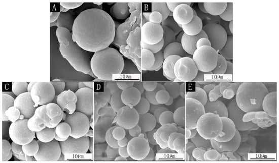 SEM of microcapsules: (A) core–wall ratio is 0.42:1; (B) core–wall ratio is 0.54:1; (C) core–wall ratio is 0.65:1; (D) core–wall ratio is 0.78:1; (E) core–wall ratio is 0.89:1.
