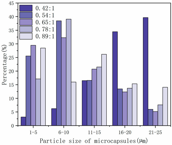 SEM images of microcapsules prepared with different core material content are shown in Figure 1, and the particle size distribution of microcapsules with different core–wall ratios is shown in Figure 2. The prepared microcapsules were round and the particle sizes were basically similar. The forming microcapsules with a 0.42:1 core–wall ratio were fewer and the particle size was larger, which is probably because the core material was too low in the emulsion system. The 0.65:1 and 0.89:1 microcapsules showed agglomeration phenomena, while the 0.54:1 and 0.78:1 microcapsules showed better morphology with less agglomeration.