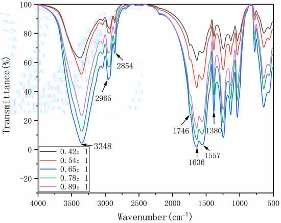 The FTIR analysis results of microcapsules are shown in Figure 3. The stretching vibration peaks of N-H and O-H are superimposed at 3348 cm−1, and the stretching vibration peaks of C=O and C-N at 1636 cm−1 and 1557 cm−1, respectively. The absorption bimodal peaks near 2965 cm−1 are from the stretching vibration of methylene in cellulose molecular structure, and the characteristic absorption peak at 1380 cm−1 represents the stretching vibration of the methyl group. These are the characteristic peaks of wall material. The stretching vibration peak of C-H at 2854 cm−1 and the stretching vibration peak of C=O at 1746 cm−1 are all characteristic peaks of tung oil in the core material. The presence of core material and wall material in the whole spectrum shows that the microcapsule coating was successful.