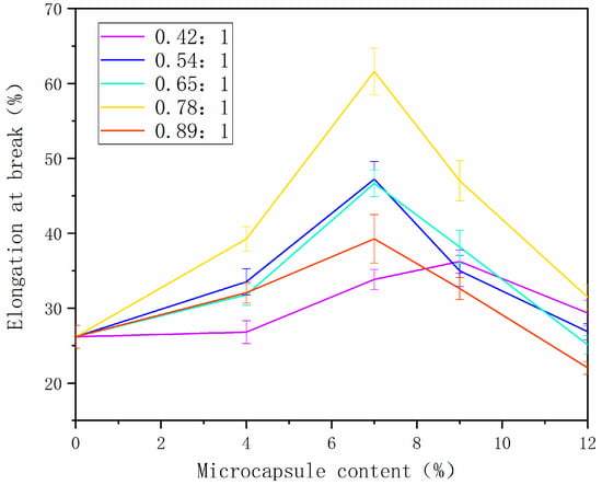 Figure 4 shows the analysis of the breaking elongation of the paint film. With the increase in microcapsule content, the breaking elongation of paint film with different core–wall ratios increased first and then decreased. This was because the cellulose increased toughness to some extent, and, when added, the microcapsules improved the breaking elongation of paint film [28,29]. Due to too much microcapsule powder, the adhesive was not enough to completely wrap the powder, and the binding force between the powder and the binder was poor, which reduced the performance. The elongation at break of paint film increased from 26.26% to 60.65% when the 0.78:1 microcapsules were added. Microcapsules have two functions: one is toughening, making the coating less prone to cracking, and the other is self-healing. If cracks occur, the cracks can be repaired. Elongation at break is a mechanical property of the coating, due to the toughness of the coating. The greater the elongation at break, the better the toughness of the coating, and the greater the increase in the service life of the coating.