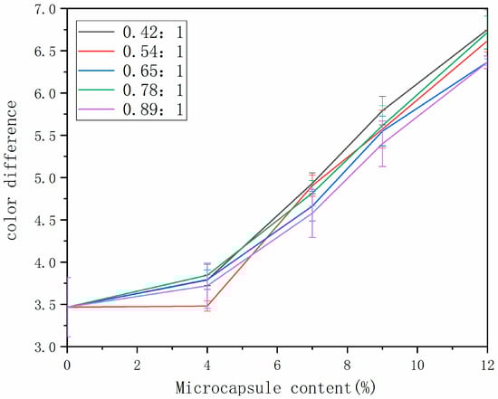 Through the study of the optical properties of the water-based paint film, the changes in color difference and gloss on the surfaces of wooden furniture before and after the addition of microcapsules were explored to judge the impact of microcapsule content on the appearance of the water-based paint film. The change in paint film color difference is in Figure 5. The color difference of the paint film increased with the increase in microcapsule content, and the color difference changed slowly when the microcapsule content was small. This was mainly because the microcapsules were white powder, and the color difference in the water-based paint film without microcapsules was the original color difference of the wood surfaces [31,32]. When the white microcapsules were added to the water-based paint, the original color of the wood was affected, resulting in the increasing color difference of the wood surface paint film. Different core–wall ratios had less effect on the color difference in paint film.