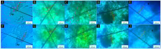 OM of self-healing test of paint film with 0.78:1 microcapsule: (A) before healing, with 0%; (B) before healing, with 4.0%; (C) before healing, with 7.0%; (D) before healing, with 9.0%; (E) before healing, with 12.0%; (F) after healing, with 0%; (G) after healing, with 4.0%; (H) after healing, with 7.0%; (I) after healing, with 9.0%; (J) after healing, with 12.0%.