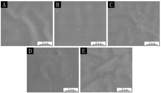 SEM images of 0.78:1 microcapsule paint film: (A) 0%, (B) 4.0%, (C) 7.0%, (D) 9.0%, (E) 12.0%.