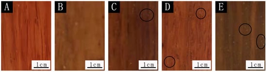 Optical photographs of the coating with 0.78:1 microcapsule paint film: (A) 0%, (B) 4.0%, (C) 7.0%, (D) 9.0%, (E) 12.0%.