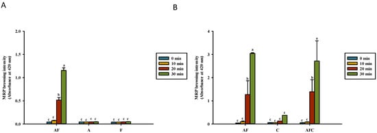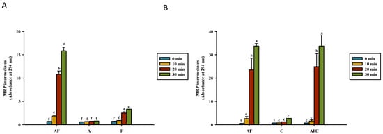 Maillard reaction product (MRP) intermediate development (OD294) for various groups upon heating in (A) water and (B) acetic acid. AF, asparagine and fructose; A, asparagine; F, fructose; C, chitosan; AFC, asparagine, fructose and chitosan. Data represent the means of three replicates, and error bars indicate standard deviation. Bars followed by a common letter are not significantly different according to the Dunn’s test at the 5% level of significance.