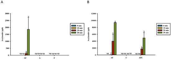 Amounts of acrylamide development for various groups upon heating in (A) water and (B) acetic acid. AF, asparagine and fructose; A, asparagine; F, fructose; C, chitosan; AFC, asparagine, fructose and chitosan. Data represent the means of three replicates, and error bars indicate standard deviation. Bars followed by a common letter are not significantly different according to the Dunn’s test at the 5% level of significance (ND, not detected).