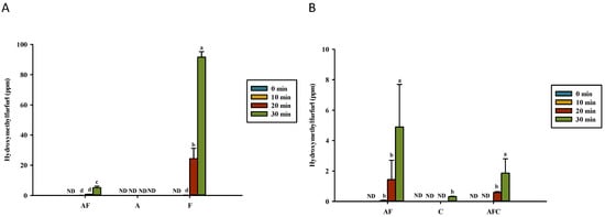 Hydroxymethylfurfural formation for various groups upon heating in (A) water and (B) acetic acid. AF, asparagine and fructose; A, asparagine; F, fructose; C, chitosan; AFC, asparagine, fructose and chitosan. Data represent the means of three replicates, and error bars indicate standard deviation. Bars followed by a common letter are not significantly different according to the Dunn’s test at the 5% level of significance (ND, not detected).