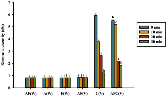 Kinematic viscosity for various groups upon heating in water or acetic acid. AF(W), asparagine and fructose in water; A(W), asparagine in water; F(W), fructose in water; AF(V), asparagine and fructose in acetic acid; C(V), chitosan in acetic acid; AFC(V), asparagine, fructose, and chitosan in acetic acid. Data represent the means of three replicates, and error bars indicate standard deviation. Bars followed by a common letter are not significantly different by the Dunn’s test at the 5% level of significance.