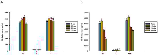 Reducing sugar concentration for various groups upon heating in (A) water and (B) acetic acid. AF, asparagine and fructose; A, asparagine; F, fructose; C, chitosan; AFC, asparagine, fructose and chitosan. Data represent the means of three replicates, and error bars indicate standard deviation. Bars followed by a common letter are not significantly different according to the Dunn’s test at the 5% level of significance (ND, not detected).