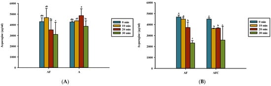 Asparagine content for various groups upon heating in (A) water and (B) acetic acid. AF, asparagine and fructose; A, asparagine; AFC, asparagine, fructose, and chitosan. Data represent the means of three replicates, and error bars indicate standard deviation. Bars followed by a common letter are not significantly different according to the Dunn’s test at the 5% level of significance.