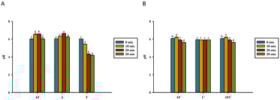Comparison of pH values for various groups upon heating in (A) water and (B) acetic acid. AF, asparagine and fructose; A, asparagine; F, fructose; C, chitosan; AFC, asparagine, fructose, and chitosan. Data represent the means of three replicates, and error bars indicate standard deviation. Bars followed by a common letter are not significantly different according to the Dunn’s test at the 5% level of significance.