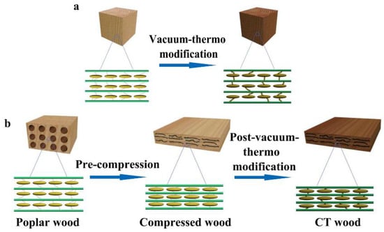 High-temperature thermal modification partially degrades hemicellulose into volatile substances with small molecules, such as organic acids, aldehydes, and furans, which reduces the mechanical properties. Among them, acidic small molecules could accelerate the degradation of polysaccharide macromolecules and, thus, adversely reduce the mechanical strength of wood [26,27,28]. Therefore, during thermal modification, timely removal of such small molecular substances by proper methods, such as vacuum treatment, is helpful for protecting the mechanical properties of the compressed wood. Therefore, combing the two ways by pre-compression and post-vacuum-thermo modification could theoretically obtain high-quality poplar wood (CT wood) with improved mechanical properties and desired dimensional stability [10]. However, such treatment has rarely been reported. Therefore, this study employed this method to modify wood with a focus on optimizing the process of vacuum thermal modification and the variation laws of wood mechanical properties and dimensional stability with the compression rate under the optimized thermo modification in order to provide a scientific basis for the wider application of such treatment (Figure 1).