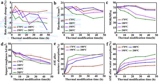 The (a) density change rate; (b) hardness; (c) modulus of rupture; (d) impact toughness of thermally modified wood at different temperatures; the ASE of wood after (e) moisture absorption at 98% humidity and (f) after water absorption with only thermal treatment.