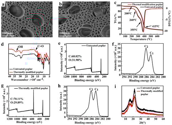 SEM morphologies of the (a) untreated wood and the (b) thermally modified wood; (c) TG curves of the untreated wood and the thermally modified wood; (d) FTIR spectra; XPS spectra of (e) untreated woods (f) the carbon element peak of untreated wood, (g) thermally modified wood, and (h) carbon element peak of the thermally modified wood; (i) X-ray diffraction pattern of untreated wood and the thermally modified wood with the temperature of thermal treatment of 190 °C.