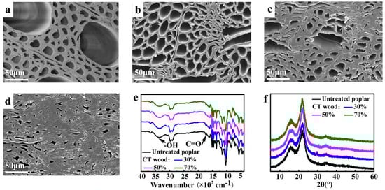 SEM of (a) untreated wood; CT wood with a (b) 30%, (c) 50%, and (d) 70% compression ratio; (e) FTIR spectrum of untreated wood and CT wood with different compression ratios; (f) X-ray diffraction patterns of untreated wood and CT wood with different compression ratios.