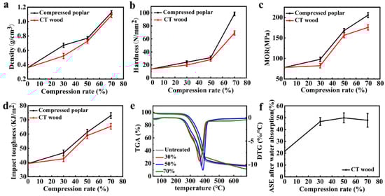Results of (a) density; (b) hardness; (c) MOR; (d) impact toughness; (e) TG curves; (f) ASE after the water absorption of the CT wood.