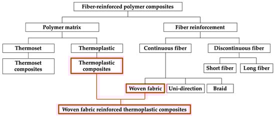 Owing to their high stiffness and strength, fiber-reinforced polymer composites have been gaining significant attention as lightweight alternatives to metals in various industries [,,,,], and they are diversely classified depending on their matrices and reinforcements [,,,,]. These classifications are outlined in Figure 1. As shown in Figure 1, fiber-reinforced polymer composites can be classified as continuous or discontinuous based on the fiber continuity, and thermoset or thermoplastic composites are based on the type of polymer matrix, etc. [,,,,]. Continuous fibers include woven fabric, uni-direction fibers, and braid. Continuous fiber-reinforced composites generally have superior mechanical properties than discontinuous, and thermoplastic composites have better impact resistance than thermoset. A woven fabric reinforced thermoplastic composite is a polymer composite composed of woven fabric and thermoplastic.