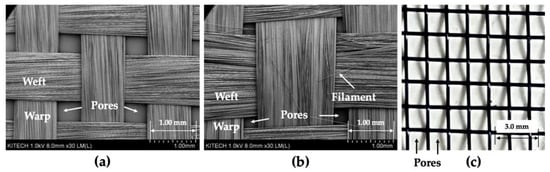 As shown in Figure 2c, carbon woven fabrics and extra meshes were used as reinforcements. Six types of mesh were tested, and only the specifications of the aluminum mesh showing the best results with the woven fabric used are shown in Table 2. The schematics of the woven fabric and mesh are shown in Figure 3. As shown in Figure 3, woven fabric and mesh are plain woven, and both the woven fabric and mesh have pores made by weft and warp. In this article, the woven fabric and mesh are represented by simplified symbols, as shown in Figure 3a,b. The top view images and geometric information of two woven fabrics and a mesh are shown in Figure 4 and Table 2. As shown in Figure 3 and Figure 4, the yarns of carbon fabric are composed of thousands of fiber filaments. The porosity of the fabrics and mesh was defined as the ratio of the area of pores per unit area. Fabric A (1k) and Fabric B (3k) have different densities, types of yarns, and porosities; the porosities of the woven fabrics are much lower than the porosity of the mesh.