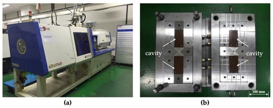 The LGE110 injection molding machine (LS Mtron) was used as shown in Figure 5a, and the specification of the injection molding machine is shown in Table 3. The mold has two cavities on the fixed and moving sides, respectively, as shown in Figure 5b. The cavities have the shape of a rectangle (50 mm × 100 mm) with a depth of 1.50 mm on both sides.