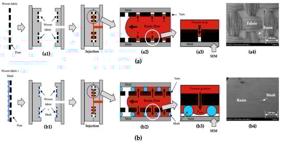 Therefore, a new structure was devised in which a mesh was placed between the woven fabric and the surface of the mold cavity, so that the surface of the composite could be impregnated with the molten resin, as shown in Figure 6(b1). When the mesh is placed between the woven fabric and the surface of the mold cavity, the surface of composite can be impregnated with the resin, as shown in Figure 6(b2). This is because a sufficient pressure gradient could be generated such that the molten resin can penetrate the pores of the woven fabric, as shown in Figure 6(b3).