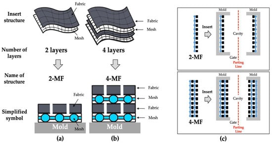 2-MF structure is a structure in which a woven fabric and a mesh are alternately laminated in two layers, as outlined in Figure 7a, and 4-MF structure is a structure in which the woven fabrics and the meshes are alternately laminated in four layers, as outlined in Figure 7b. Two types of woven fabric, Fabric A (1k) and Fabric B (3k), were used and laminated into two types of structures, 2-MF and 4-MF, respectively. The woven fabrics and meshes of the 2-MF and 4-MF structures were placed on the surface of the moving and fixed sides of the mold cavity, respectively, as shown in Figure 7c, and were then injection molded. The injection molding conditions are outlined in Table 4, the mesh-inserted composite could be molded in less than 1 min for most of applications, including the cooling time.
