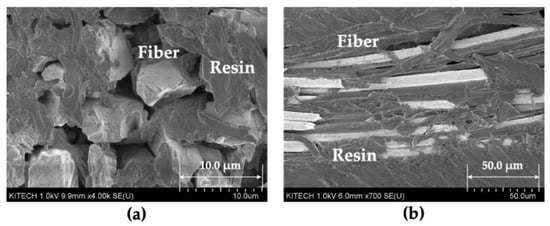To confirm that the fiber filaments of woven fabric were impregnated with the molten resin, SEM observations were performed on the warp and weft of the 4-MF (3k) composite (case #4), which had the highest fiber volume fraction among the molded composites. The SEM images of the 4-MF composite are shown in Figure 9. These images show that the molten resin not only filled in the pores of woven fabric, but also covered the fiber filaments of the yarns.