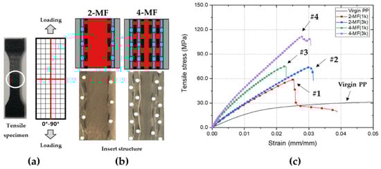 Tensile tests were performed in the direction parallel to the yarns of the woven fabric to confirm the mechanical properties of the mesh-inserted composites, as shown in Figure 10a,b. Table 6 shows the comparison of the tensile test results of the virgin PP and the mesh-inserted composites. The respective tensile stress–strain curves are shown in Figure 10c.