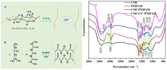 The pH-responsive CMC solution was crosslinked by adding Ca2+. In an aqueous solution, CMC was chelated by the high-valence cation Ca2+ to form a stable gel structure []. The formation process of the pH-responsive CMC gel network is shown in Figure 1a. The polymer NIPAM was used as the temperature-sensitive compound, MBA was used as a crosslinking agent, APS was used as an initiator, and TEMED was used as an accelerator. The temperature-responsive PNIPAM hydrogel network was prepared via radical polymerization, as shown in Figure 1b []. The pH-responsive CMC gel network and the temperature-responsive PNIPAM hydrogel network were interspersed to construct a hydrogel with mutual transmission network, and then the solvent solution was replaced by ethanol solution, and finally freeze-dried to obtain temperature/pH-responsive CMC/poly (N-isopropyl acrylamide) IPN aerogels.
