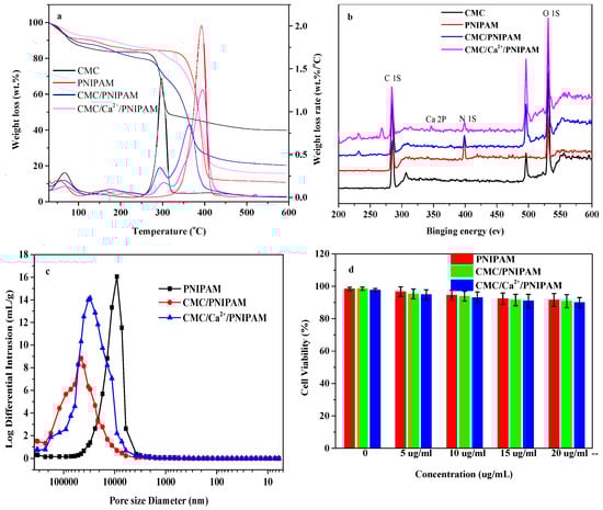 Figure 2a shows the thermogravimetric loss curves of CMC and the PNIPAM, CMC/PNIPAM, and CMC/Ca2+/PNIPAM aerogels. The weights of the CMC and aerogel samples gradually decreased from room temperature to 150 °C, which is attributed to the loss of moisture []. The main degradation temperature of CMC/NIPAM and CMC/Ca2+/PNIPAM aerogel was 250 °C–600 °C, which can be divided into two stages: The first stage is 250 °C–320 °C, in which the main chain of cellulose is broken [], and the second stage is 320 °C–600 °C, which may be due to the decomposition of the PNIPAM side chain, consistent with the description in the literature []. The thermal weight loss curve of the CMC/PNIPAM aerogel material is basically the same as that of the PNIPAM aerogel material. For the CMC/PNIPAM and PNIPAM aerogel materials, the maximum degradation temperatures of the first stage were 295 °C and 300 °C, respectively; the maximum degradation temperatures of the second stage were 365 °C and 390 °C, respectively; and the residual amount at 600 °C was basically the same. After the CMC/Ca2+/PNIPAM aerogel was crosslinked by Ca2+ ions, the maximum degradation temperature and the residual rate of the sample increased. The crosslinking of Ca2+ led to a higher thermal stability of the aerogels, which was consistent with the results of the literature [].