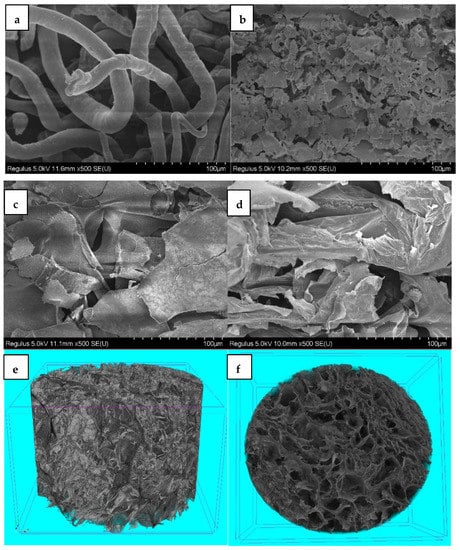 Figure 3 displays the SEM images of CMC (a) and the PNIPAM (b), CMC/PNIPAM (c), and CMC/Ca2+/PNIPAM aerogels (d). The SEM spectrum of pure CMC (Figure 3a) shows that the CMC is cylindrical and that no chemical crosslinking occurs between the fibers. Figure 3b shows that the pure PNIPAM aerogels exhibited an interrelated layered porous structure with a pore size from a few hundred nanometers to tens of microns. Figure 3c shows that CMC was well embedded in the network structure of the CMC/PNIPAM aerogels, indicating that the functional groups on the CMC surface combined with NIPAM groups to form hydrogen bonds. This causes the aerogels to form a semi-interpenetrating network structure. The SEM spectrum of the CMC/Ca2+/PNIPAM aerogels (Figure 3d) shows that the network formed by Ca2+ crosslinked with CMC, and the PNIPAM network interpenetrated to form an interpenetrating three-dimensional network structure, which formed a more uniform pore structure. The pixel size of each image is 4032 × 4032, and the resolution is 500 nm (Figure 3e,f). Micro-CT stereogram (Figure 3e) and cross section (Figure 3f) show that CMC/Ca2+/PNIPAM aerogel has a more uniform pore structure, consistent with SEM results.