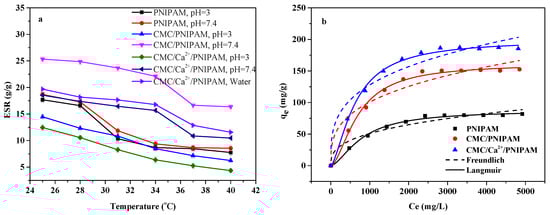 Figure 4a shows the swelling properties of PNIPAM, CMC/PNIPAM, and CMC/Ca2+/PNIPAM aerogels. As can be observed from the figure, as the temperature increased, the swelling properties of the three aerogel materials gradually decreased and tended to be stable. As the lower critical solution temperature (LCST) of the PNIPAM aerogel material was about 32 °C [], the aerogels’ swelling performance decreased most at 31 °C–34 °C. The above figure also shows that the LCSTs of the CMC/PNIPAM and CMC/Ca2+/PNIPAM aerogels were about 37 °C, and the aerogel swelling performance was significantly reduced at this temperature. The swelling properties of the three aerogel materials changed with temperature, indicating that they had good temperature-sensitive properties. Moreover, the swelling properties of CMC/PNIPAM and CMC/Ca2+/PNIPAM aerogels at pH 3 were significantly lower than that at pH 7.4, which was because at lower pH conditions, CMC is protonated to insoluble CMC acid, resulting in a lower swelling ratio. Under higher pH conditions, when CMC is converted into sodium salt, its swelling behavior increases. Under the conditions of lower than LCST and high pH, the amide group of PNIPAN and the carboxyl group of CMC polymers in the aerogel form hydrogen bonds with water molecules and are in a hydrophilic state, and the swelling performance of the aerogel is high []. In contrast, at conditions above the LCST and at low pH, the hydrogen bonds between the polymer and water molecules are disrupted, and the conformation of the aerogel polymer changes from a loose coil to a folded chain, which is characteristic of the hydrophobic state and more low swelling properties [,]. Furthermore, the swelling performance of the CMC/Ca2+/PNIPAM aerogel was lower than that of the CMC/PNIPAM aerogel; this was mainly due to the physical crosslinking of Ca2+ and the carboxyl functional groups of CMC to form a tighter network structure, which led to a decrease in the CMC/Ca2+/PNIPAM aerogel swelling performance []. The LCST temperature of aerogels in acidic PBS buffer solutions is slightly lower than that in neutral PBS buffer conditions. The introduction of calcium ions leads to a slight decrease in the LCST temperature of the aerogel, which is consistent with the effect of salt ions on the critical temperature in the literature [].