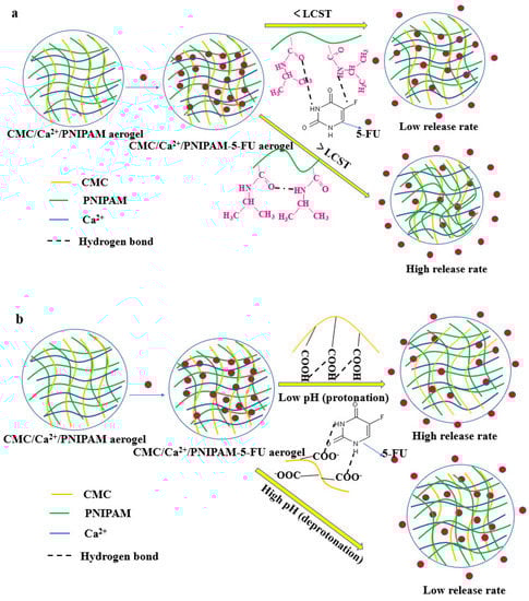 The pKa of 5-FU is about 8, which makes most of its drug molecules uncharged, and the loading of aerogel drugs is mainly through the amino group in PNIPAM and the carboxyl group in CMC polymer to form hydrogen bonds with drug molecules or through the physical encapsulation of the gel network. Under different temperature and pH conditions, the aerogel network and the strength of hydrogen bonds formed with drug molecules will change differently, resulting in rapid or slow release of the drug. Figure 6 depicts the release mechanism of the drug-loaded aerogels in different solutions. As shown in Figure 6a, the PNIPAM polymer chain conformation expanded below the LCST, but its expansion behavior was limited by the aerogels’ structure. This led to the formation of an internal hydrophobic microenvironment in aerogels, and 5-FU drugs accumulated inside the aerogels, resulting in a lower diffusion rate. However, when the temperature is 37 °C, the PNIPAM polymer chains would entangle and polymerize, causing the aerogel structure to shrink, thereby accelerating the drug release from the aerogel center [,]. These results indicate that the prepared drug-loaded aerogel has good temperature-sensitive stimulation properties. As shown in Figure 6b, at a low pH condition, the carboxyl groups on the drug carrier were protonated to form hydrogen bonds, and the aerogels’ structure shrank inward, causing the drug to be squeezed and released. As the pH increased, the carboxyl groups on the drug carrier formed an anionic end group. Due to the mutual repulsion of same charges, the aerogels’ volume will expand outwardly, and the concentration gradient will result in the drug release [].