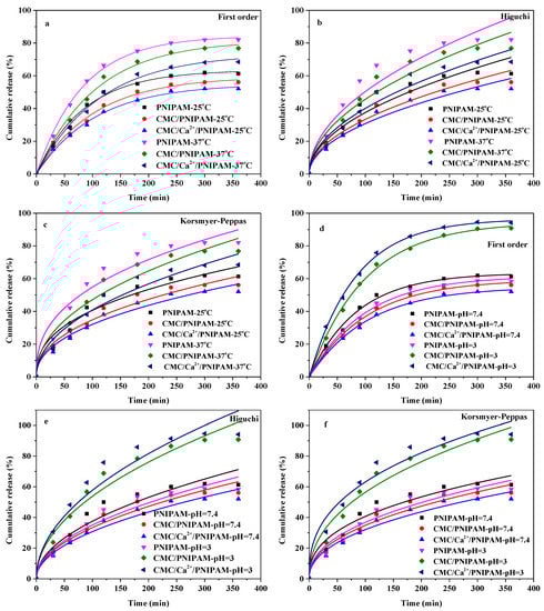 Figure 7 shows the fitting curves of the sustained-release kinetics of the drug-loaded PNIPAM, CMC/PNIPAM, and CMC/Ca2+/PNIPAM aerogels. Various release kinetic models (including first-order kinetic models and Higuchi and Korsmeyer–Peppas models) were used to fit the drug release data of the three 5-FU-loaded aerogels under different temperature and pH conditions. The results demonstrated that the first-order kinetic model and the Korsmeyer–Peppas model were more accurate in fitting the sustained-release curve of the drug. The results of the Korsmeyer–Peppas model demonstrated that the release of the drug was mainly controlled by diffusion, and the extrusion of the drug was accelerated due to the shrinkage of the aerogel structure [].