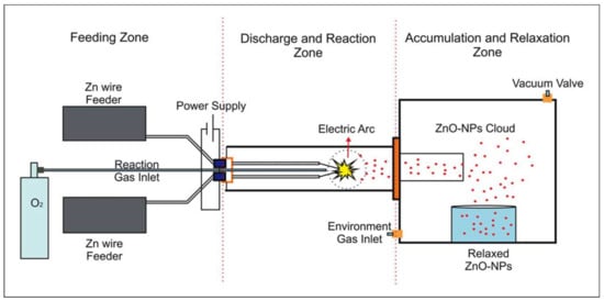 The synthesis was carried out using a high-purity Zn wire (99.99%) in the presence of oxygen as a carrier and oxidizing gas. The typical reaction to produce ZnO-NPs comprises an O2 flow of 50 sccm, a precursor wire velocity of 1.5 cm/s, electrode contact angle of 45°, and reaction voltage set at 220 V. The reaction was pulsed to prevent reactor overheating, with nucleation time, growth, and relaxation of 60 min. Nanoparticles were collected in a storage chamber in an inert atmosphere. A more detailed schematic of the controlled atmosphere arc discharge machine (DARC-AC) can be found in Figure 1 [38].