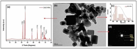 In order to determine the morphology of the nanostructures, XRD and TEM analyses were performed. In Figure 2a, the DRX pattern is shown, where characteristic peaks at 2θ = 31.7°, 33.9°, 36.2°, 47.3°, 56.4°, 62.7°, 67.8°, and 68.8° correspond to planes (100), (002), (101), (102), (1110), (103), (200), (112), and (201), respectively, which can be indexed to a wurtzite-type hexagonal ZnO material. Similar results are reported in the research of C. Medina et al. [38], who performed the synthesis of zinc oxide nanoparticles through the same method, showing characteristic peaks of zinc oxide nanoparticles; this corroborates the production of high purity wurtzite zinc oxide. These results are in agreement with those shown in Figure 2d, where interplanar distances (dhkl) of 2.60, 2.48, 1.91, and 1.14 Å were shown, corresponding to planes (002), (101), (102), and (202) for ZnO hexagonal-type wurtzite.