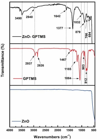 FTIR, ZnO-NPs, GPTMS, and ZnO-NPs-GPTMS spectra.