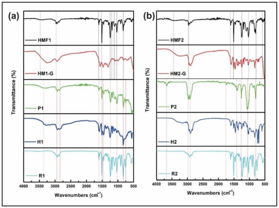 Comparison of FTIR spectra of the hybrid materials obtained (HMF1 and HMF2), obtained with the two resins (a) R1 and (b) R2, with their respective hardeners. The spectrum of the single cross-linked resin (P1 and P2) and the resin mixed with the GPTMS is presented to verify reactivity.