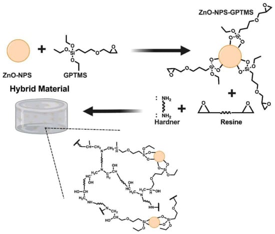 Meanwhile, for the hybrid material HMF2, the spectra shown in Figure 4b exhibits similar changes, as far as vibrational movements are concerned. That is, at 1292 cm−1, a vibration movement is shown that can be attached to a C-N bond; the split of the peak is verified to the ~1080 cm−1 belonging to the polymer P2 in two new peaks: one at 1028 cm−1 and another at 1105 cm−1. The first is associated with the anchoring of the ZnO-NPs, since it represents the Si-O-Si bond, and the second to a C-O bond, typical of the union between the resin and the hardener. The SiO-H vibration is also displayed at 3435 cm−1, from the same functionalization process. Spectra were made of the polymer obtained with each resin (P1 and P2), which were compared with the polymers obtained by mixing the resin, hardener, and GPTMS (HM1-G and HM2-G), and the hybrid material obtained by the cross-linking reaction of each resin with its respective hardener and the ZnO-NPs-GPTMS (HMF1 and HMF2), in order to identify the characteristic signals of each material and to be able to ensure the formation of the hybrid material. The synthesis mechanism for HMFs is shown in Figure 5.