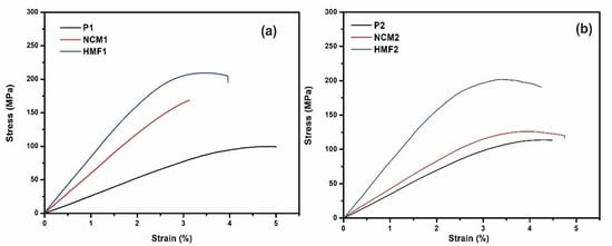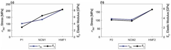 The results of the bending tests are shown in Figure 6. For configuration 1 (P1, NCM1, HMF1), a noticeable increase in mechanical behavior in this state of load is observed. When comparing the NCM1 nanocomposite material with the P1 base material, there is an increase in the elastic modulus (Ef) and in the maximum bending force (σfm) of 119% and 31%, respectively (See Figure 7a). We see an increase in the slope of the stress–curve deformation. This improvement is attributed to the physical or mechanical interaction of the NPs and the epoxy matrix increasing the surface area benefiting the performance of the nano-reinforced material; however, it indicates that it is more fragile and loses ductility [45].