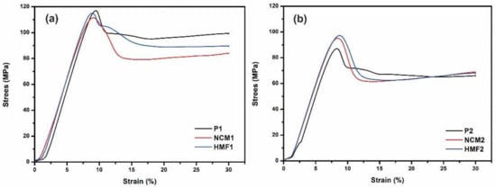 Graphic of the compression resistance for (a) test pieces made with cured resin 1 (P1), nanocomposite made with resin 1 and ZnO-NPs without functionalization (NCM1), and hybrid material (HMF1) and (b) test pieces made from cured resin 2 (P2), nanocomposite made from non-functioning resin 2, and ZnO-NPs (NCM2) and hybrid material (HMF2).