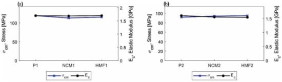 Graphic comparative summary of the maximum effort and elastic modulus in compression. (a) Specimens manufactured with configuration 1 (P1, NCM1, and HFM1) and (b) specimens manufactured with configuration 2 (P2, NCM2, and HFM2).