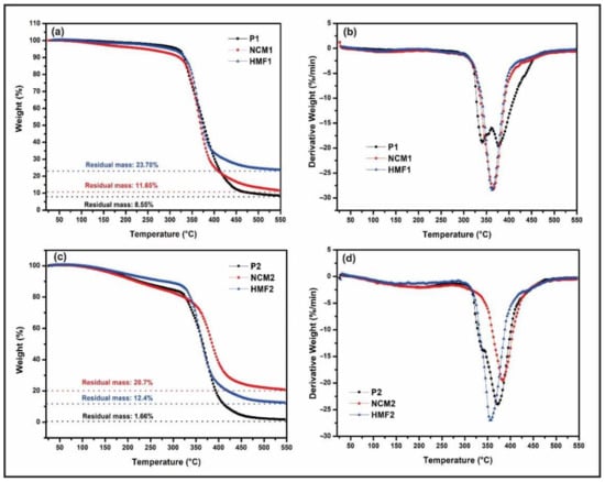 TGA and DTG analysis of the obtained materials. (a,b) Comparison of TGA and DTG analyses for P1, NCM1, and HMF1, respectively. (c,d) Comparison of TGA and DTG analyses for P2, NCM2, and HMF2, respectively.