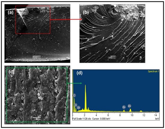 Regarding HMF2, the lines showing the direction of the beginning of the fracture can be observed in the lower right area of the test piece (Figure 12a,b). It can be determined that the fracture began around the cavity present in that area, and the morphology of the fracture is typical of a fragile fracture. In addition, micrographs show a surface not free of small porosities, typical of the manufacturing process (mixing process). SEM mapping analysis for micrography (Figure S5) demonstrates the homogeneity of the carbon and oxygen elements within the matrix in that area and an inhomogeneity of the zinc element from the nanoparticles, which is related to the dispersion problem that arose in the manufacturing of the test pieces.