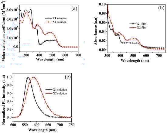 (a) UV–Vis absorption spectra of X1, X2 in DCM solution; (b) Absorption spectra of X1, X2 recorded in film state; (c) Emission spectra of X1, X2 in DCM solution.