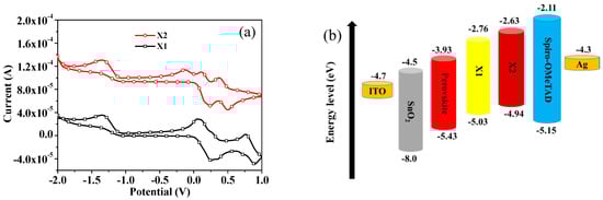 The electrochemical properties of the new HTMs were studied utilizing cyclic voltammetry (CV), which is displayed in Figure 2a. The HOMO and LUMO energy levels of these mixtures were estimated by cyclic voltammetry in dichloromethane (1 × 10−3 M) at 25 °C using tetrabutylammonium hexafluorophosphate as the electrolyte. All redox potentials were referenced to ferrocene, which was utilized as an internal standard for calibrating the potential and calculating the HOMO levels. The redox peaks of X1 and X2 were both quasi-reversible, indicating that these two HTMs have good electrochemical stability. The HOMO of X1 and X2 was determined as −5.03 and −4.94 eV, respectively, which is higher than that of the perovskite valence band (ca. −5.43 eV) [60]. This demonstrates that it can provide sufficient driving force to the injection of holes from the perovskite into HTML. The open-circuit voltage in the PSCs was determined from the difference between the Fermi level of TiO2 and the HOMO of the HTMs [68]. The HOMO of X2 being higher than that of X1 is due to inserting the electron-rich thiophene moiety between the diarylamine and anthracene, and the lower HOMO of X1 might assist with carrying out a higher open-circuit voltage in the X1-based PSC device. In correlation, the HOMO energy level of spiro-OMeTAD was −5.15 eV [60]. The schematic energy levels of X1, X2, and spiro-OMeTAD as an HTM are shown in Figure 2b.