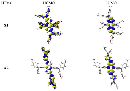 The photophysical properties of X1 and X2 were investigated. Figure 1 shows the UV–Vis absorption and fluorescence (FL) spectra of these compounds in DCM (1 × 10−5 M) solution and as solid films, and the resulting data are summarized in Table 1. The absorption spectra of X1 and X2 display absorption bands around 300–580 nm, as shown in Figure 1a. The shorter wavelength peaks at 300–400 nm are attributed to the localized π-π∗ electronic transition. The lower-energy absorption peaks of X1 and X2 were 523 nm (ε = 1.49 × 105 M−1 cm−1) and 486 nm (ε = 3.12 × 105 M−1 cm−1), respectively, which are ascribed to the intramolecular charge transfer (ICT) with a more delocalized π-π* transition character. The λmax of the ICT band in X1 being larger than that of X2 indicates the stronger intramolecular charge transfer of X1 than that of X2. The absorption spectra of X1 and X2 in the thin-film state (Figure 1b) show a bathochromic shift of 10–39 nm compared with the solutions, which is due to the intermolecular interaction in the films. The photoluminescence spectra of X1 and X2 are shown in Figure 1c. The maximum emission peak of X1 and X2 was observed at 564 and 589 nm with Stokes shift of 34 and 103 nm, respectively. The Stokes shifts between the absorption and the emission bands were likewise supported for charge-transfer characteristics in both molecules. The optical band-gap energies acquired from the intersection of absorption and emission spectra of X1 and X2 were 2.28 and 2.31 eV, respectively. The absorption and emission spectra of compounds X1 and X2 in variant solvents are displayed in Figure S1. No obvious solvent effect was observed on the absorption of X1 or X2 in various solvents. The emission bands of X1 and X2 were slightly sensitive to solvent polarity. The emission bands showed a slightly bathochromic shift for X1 and X2 in high-polarity solvents, which indicates the existence of twisted intramolecular-charge-transfer (ICT) excited states [67]. Both the synthesized HTMs displayed large absorption and emission spectra ranges with large Stokes-shift values as compared with those of the reference compound spiro-OMeTAD.