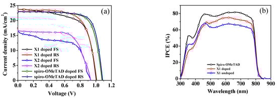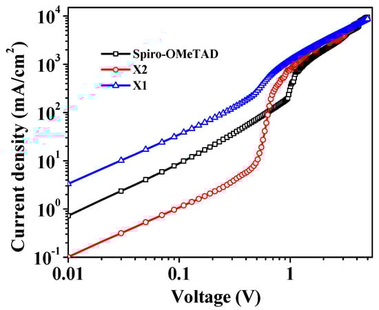 Space-charge limitation of current in the J−V characteristics of the device with X1, X2, and Spiro-OMeTAD HTMs.